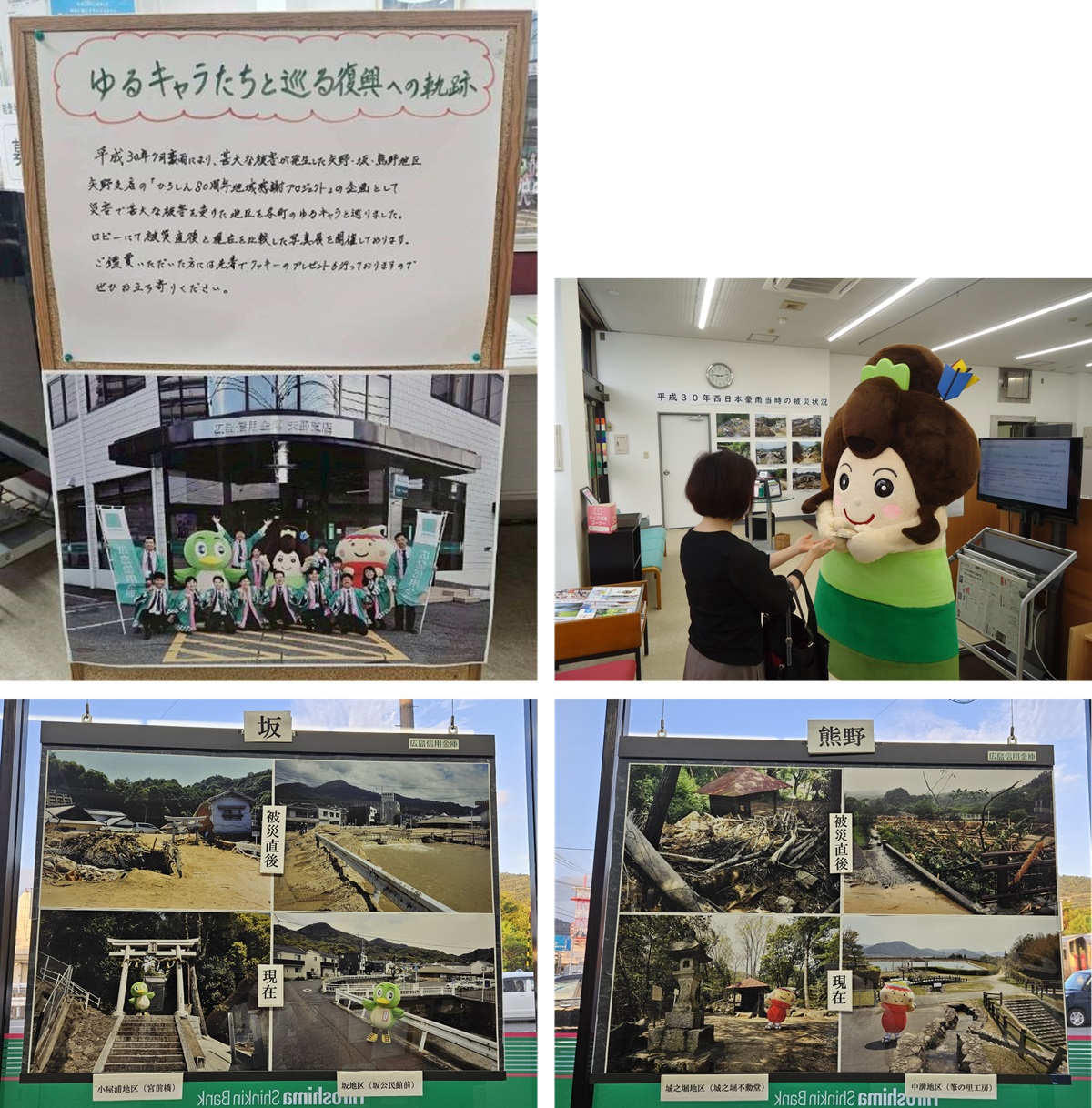 平成30年7月豪雨により、矢野・坂・熊野地区は甚大な被害が発生しました。その記憶を風化させないために、各町のゆるキャラたちと復興した地区を巡り、矢野支店のロビーにて被災直後と現在を比較した写真展を、2025年5月1日(木)~9月30日(火)の日程で開催しました。